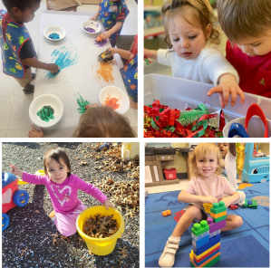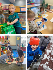 Diapers are still checked every two hours and teacher attend to individual needs throughout the day. These children are also more independent than our infants in that they no longer have bottles (only sippy cups), feed themselves snacks (center provided) and lunch (parent provided) together at tables, move up and down stairs without being carried, have only one afternoon nap, and enjoy higher levels of activity. Children have the opportunity to begin pretend play within their classroom, listen to books and complete hands-on projects to match their themed lessons each week, and play outdoors each day, weather permitting.
